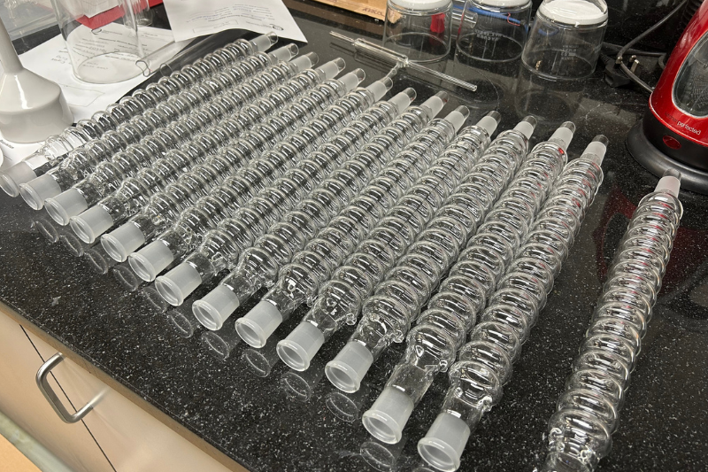 With the help of George Burton, Queen's Glass Blower, School of Chemistry have created a number of waterless condensers to replace water-cooled condensers traditionally used during student experiments. This project will replace 25 reflux condensers, saving many thousands of litres of water every year.