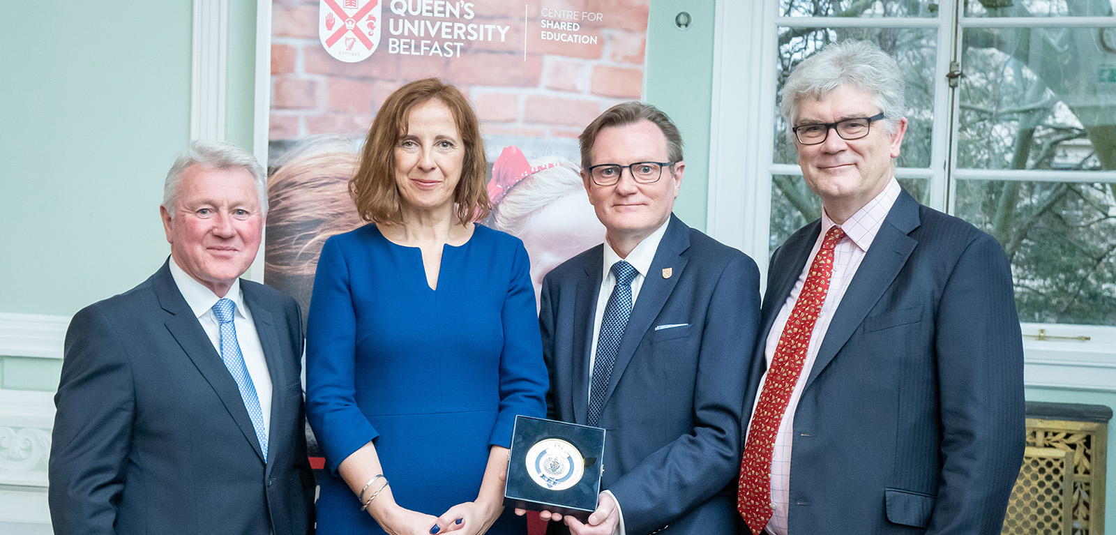 Pictured left to right: Pro-Chancellor and Chair of Senate - Mr Stephen Prenter MBE, F.C.A; Joanne Hughes, Director of the Centre for Shared Education at Queen’s University Belfast; Professor Ian Greer, Vice-Chancellor of Queen’s University Belfast and Professor Tony Gallagher from the Centre for Shared Education.