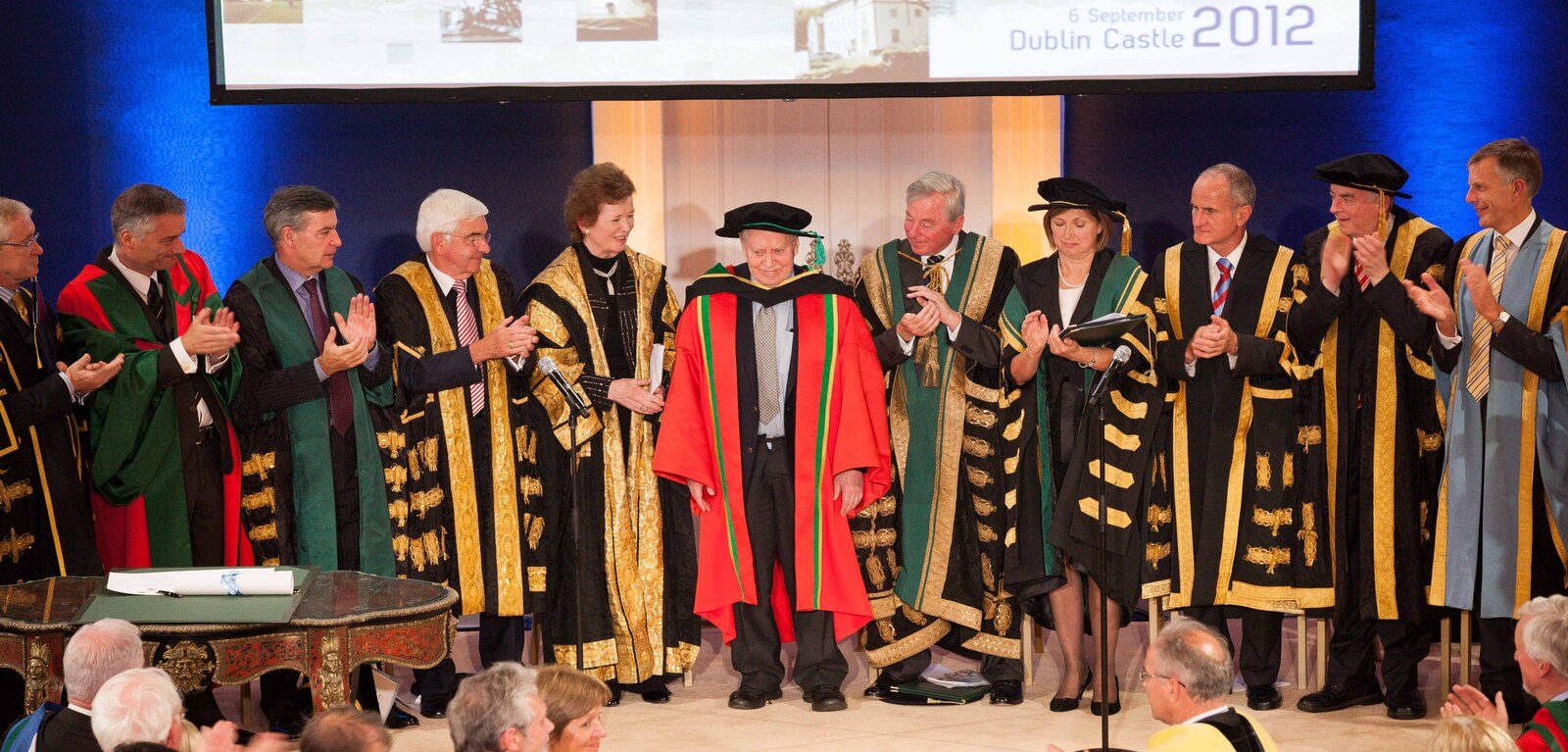 Chuck Feeney (pictured centre) receiving a joint honorary Doctorate of Laws (LLD) from 10 universities on the island of Ireland in 2012. Photo credit: Susan Kennedy, Lensmen.ie provided by NUI.