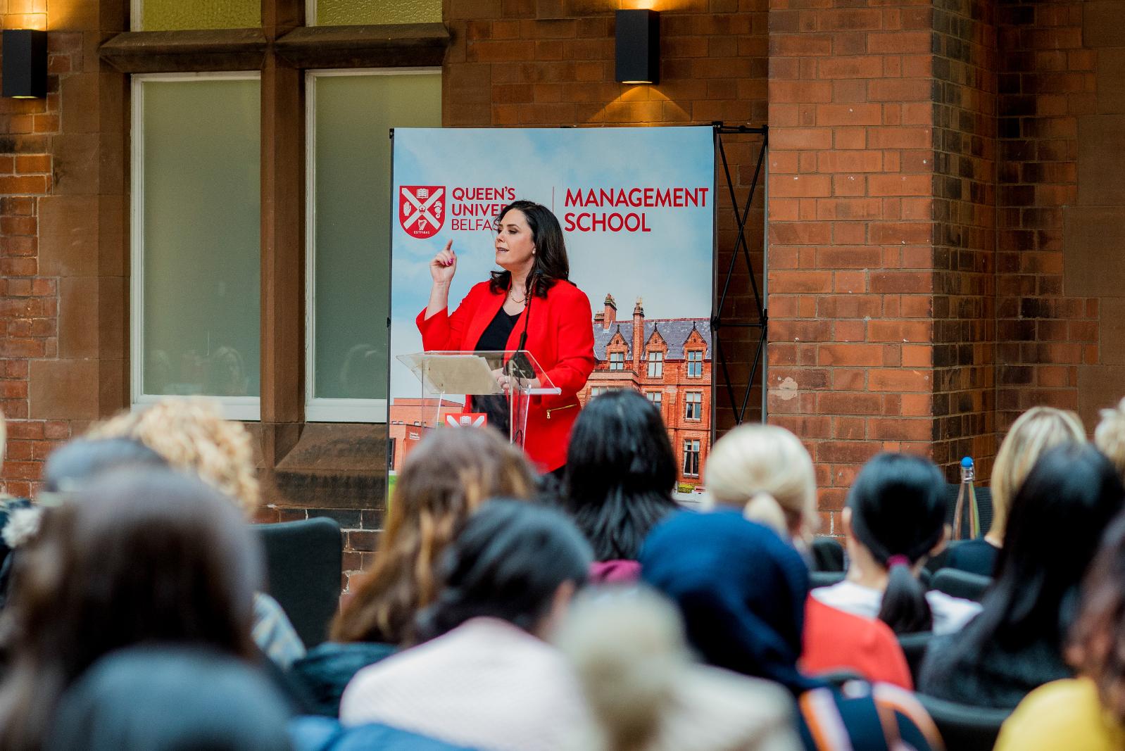 There was a excited crowd of staff, students and members of the public in the audience at the magnificent Isdell Courtyard, in Queen's University Beflast's Riddel Hall to hear Dr Sands lecture, 'The Future of Work and Women'.