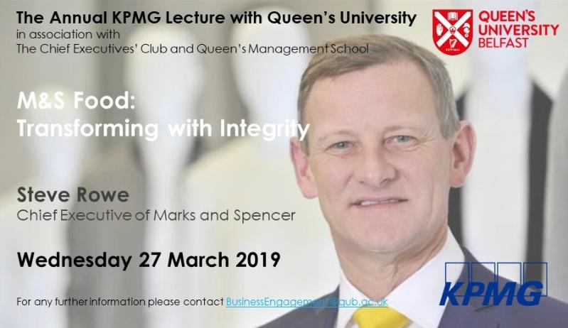 The Annual KPMG Lecture in association with The Chief Executives' Club at Queen's and Queen's University Management School are delighted to host a keynote lecture from Steve Rowe, Chief Executive at Marks and Spencer.