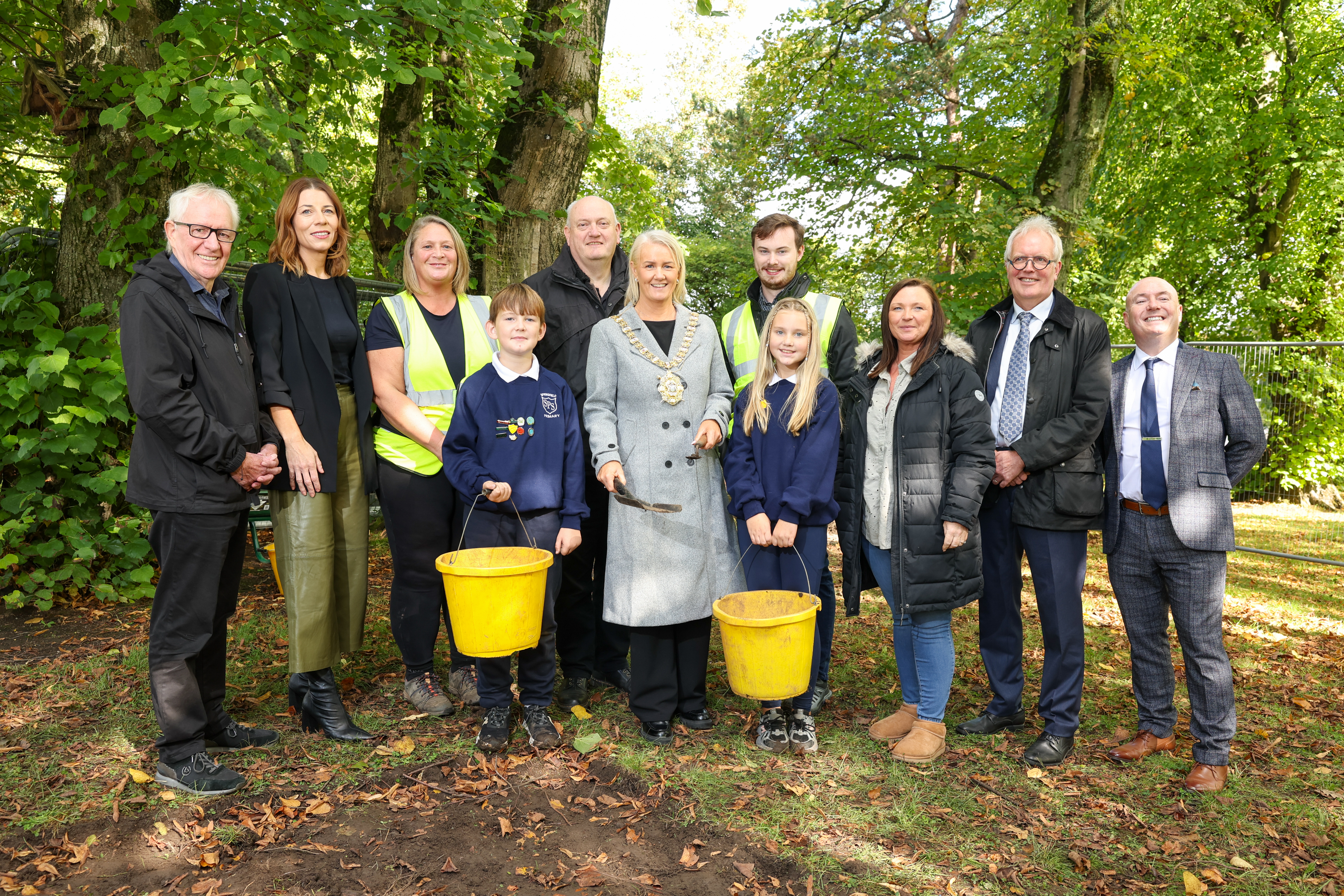 L-R: Dr Jackie Redpath, Co-CEO Greater Shankill Partnership; Aileen Cummins, Head of Social Impact and Civic Responsibility; Dr Heather Montgomery, CAPNI Project Manager; Dr Colm Donnelly, Directory of Centre for Community Archaeology; The Rt. Hon. the Lord Mayor, Councillor Tracy Kelly; Bradley Loftus, Belfast City Council; Nicola Verner, Co-CEO Greater Shankill Partnership; Professor Geert Dewulf, Pro-Vice-Chancellor for the Faculty of Engineering and Physical Sciences; Steven Osborne, Principal Springfield Primary School.