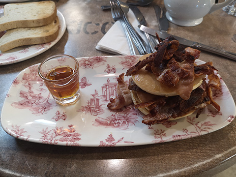 Bushmills is literally down the road from The Giants Causeway so I found it to be a great place to stop for breakfast. Within the small main square there’s a choice of about three cafes and restaurants. I chose The Copper Kettle because it was decked out for the holiday season. I was tempted to get the traditional fry but was won over by the pancakes with Old Bushmills Whiskey syrup.