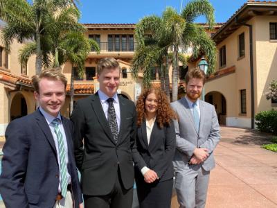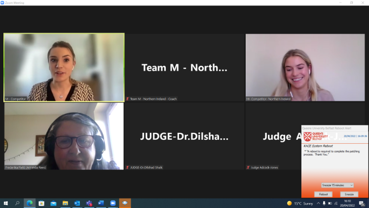 Robert Bellingham, Leah Taylor, Daniel Spence and Thomas Stewart (coach) participating in the International Environmental Moot Competition hosted by the Law Society of Ireland, Blackhall Place, Dublin.