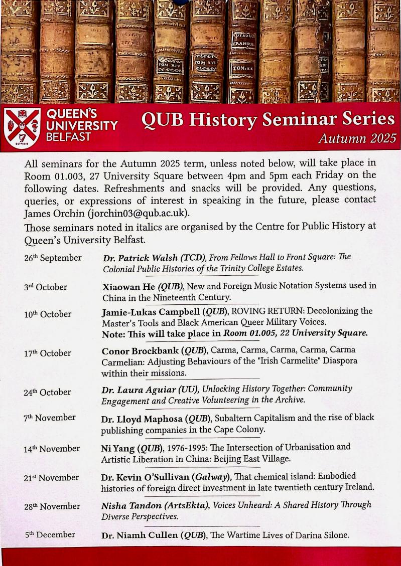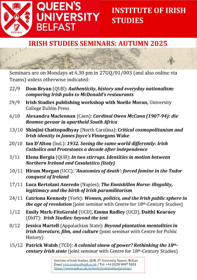 All seminars will take place at 6pm in Institute of Irish Studies, 27 University Square, 01/003, Queen’s University Belfast (unless otherwise stated). If you would like to attend online, please get in touch and I will send you the Teams link.