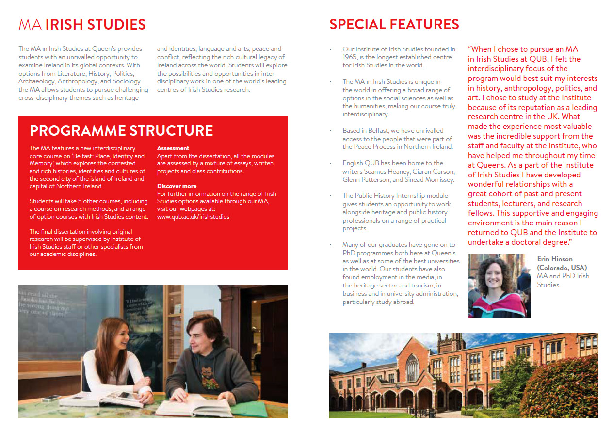 Including information on our 'Belfast: Place, Identity and Memory in a Contested City’ core module and new interdisciplinary option modules on Medieval Ireland and Language Revival, Reconciliation and Politics in Northern Ireland.