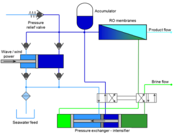 The production of fresh water directly from a renewable energy source such as wind or wave power has a number of inherent advantages. In particular, the mechanical energy from a wind turbine or wave energy converter can be used to directly pressurise water to be used in a reverse osmosis (RO) desalination plant. This eliminates the costs and loss of energy associated with conversion of the energy first into electricity and then into pressurised water, which occurs in traditional desalination plants powered by renewable energy. However, the direct use of renewable energy for desalination complicates the RO desalination plant as traditionally these have been designed for an unvarying energy supply.