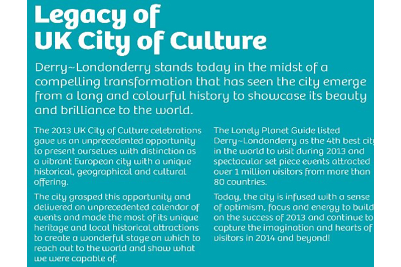 This findings from this research featured prominently, and informed, in internal debates within Derry City and Strabane District Council on the role of cultural planning in the economic development of the area. Evidence of this is the citation of our academic publications in the official evaluation of UK City of Culture (Derry City and Strabane District Council, 2016). On academic matters, our publications have contributed to ongoing debates, locally, nationally, and internationally, on the impact and legacy of cultural events. The researchers disseminate their findings at UK, European and international planning and geography conferences. Following the publications the PI was invited to join to the Cultural Policy Observatory Ireland, and AHRC Cities of Culture Network.