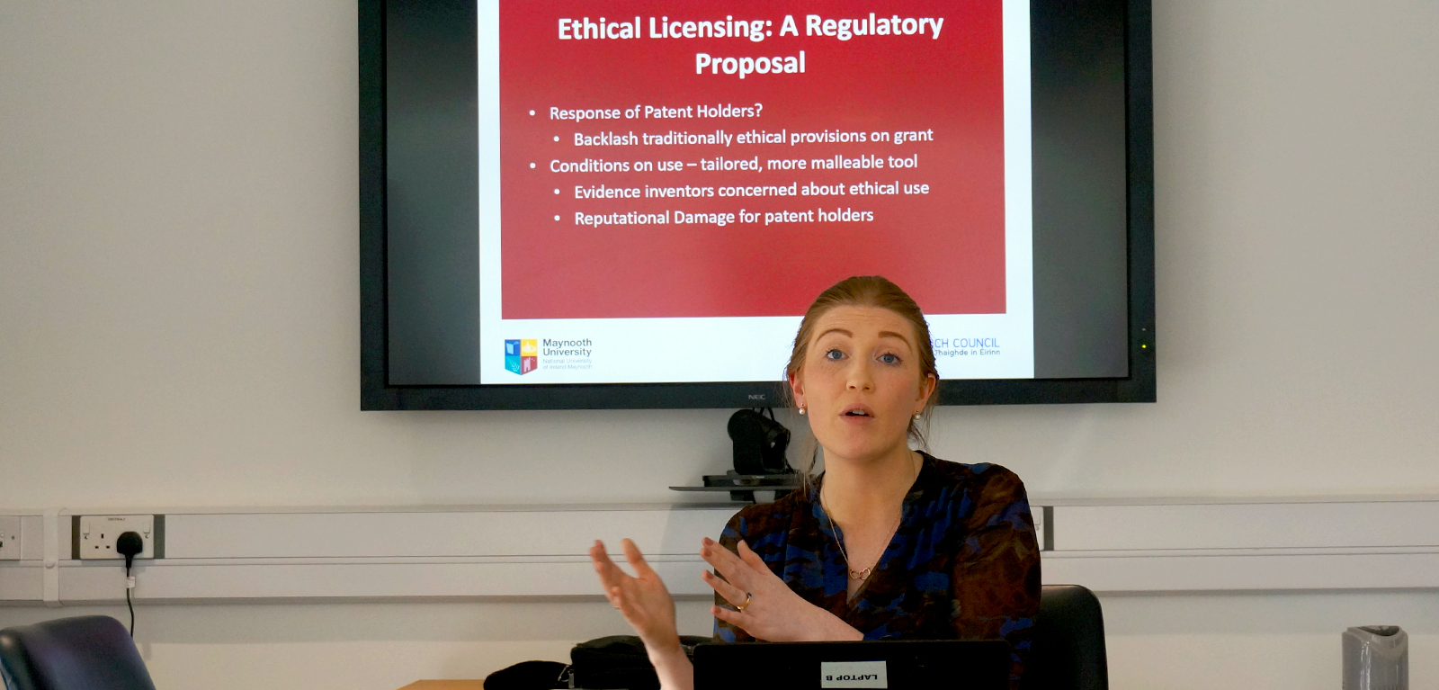 On Thursday 27 February, the School of Law welcomed Dr Aisling McMahon, Assistant Professor from the Department of Law at Maynooth University for the delivery of the inaugural seminar of the “Health Law and Ethics” seminar series. Her seminar was entitled ‘Biotechnology, Patents and Licensing for ‘Ethical’ Use: A regulatory Opportunity?’ She spoke on the implications and extents of licensing of patents and their potential utilisation and application on new technologies in the development of ethical usage.
