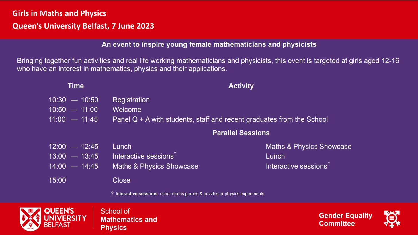 The event is sponsored by Queen's School of Mathematics and Physics and the Athena SWAN Initiative.
