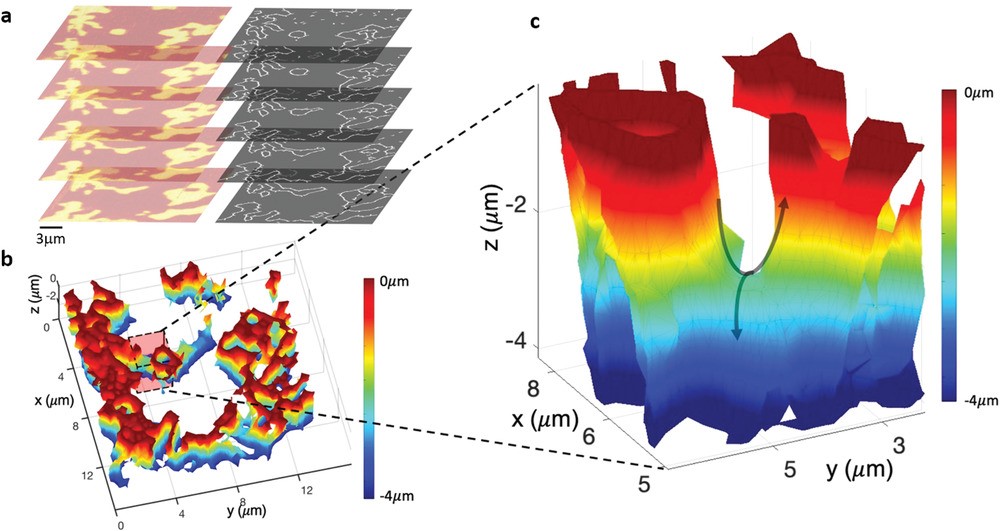 The three-dimensional picture of lead germanate that we have created allows us to conclude two important things: the first is that the domain microstructure does not consist of isolated domains inside a matrix of another, as was initially thought, but instead the domain wall interestingly forms a saddle point at the position (see Figure 1) where the two domain types merge, a unique and interesting structure in itself. The second answers a more fundamental question about the behaviour at the domain walls. It has been well established that ferroelectric domain walls can often display enhanced conductivity in comparison to surrounding domains. This is surprisingly not true, however, for lead germanate. The interesting domain structure revealed by our TPFM experiments offers an explanation for this. The research findings have been recently published in Advanced Materials, one of the most highly regarded journals in physics and materials science.
