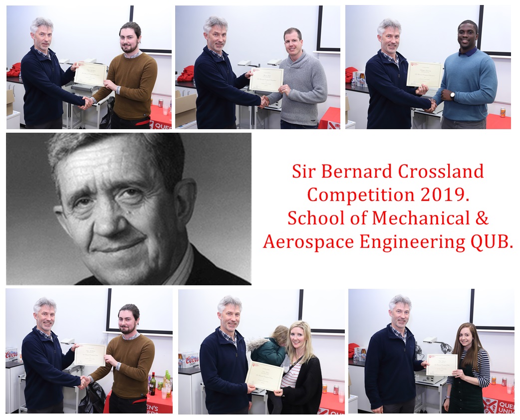 Friday 11th January 2019 saw the announcement of the Sir Bernard Crossland Poster & Presentation Prizes for the School of Mechanical & Aerospace Engineering at Queens.  The quality of the entries spanning the breadth and depth of the research projects that are ongoing at PhD level within the School, was clear based on the performance of all of our participants!  The winners are listed below.  Congratulations to Ryan MCFadden who won the Presentation and the Poster compeition!