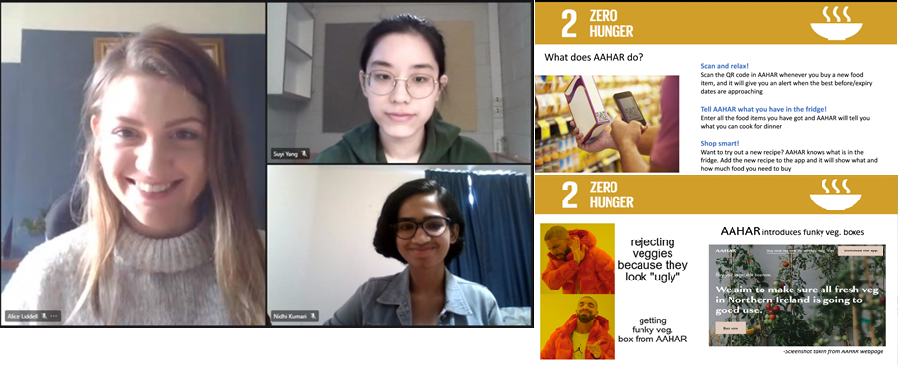 Congratulations to our own UG Alice Liddell (SMAE), and her teammates Suyi Yang (Psychology) and Nidhi Kumari (EEECS) for their winning entry in the ‘Building Good Together’ innovation competition! The SWAN organised and EPS-funded competition brought together female students from all Schools to create teams and combine their skills to develop and propose solutions to an identified social problem. 1st place team AAHAR tackled Food Waste and Food Poverty using a multi-part approach: an app that scanned QR codes to alert people to food about to go out of date, a pantry and fridge food tracking system, and a Funky Veg delivery system that allows purchase of ‘ugly’ fruits and veg that are aesthetically rejected by main stream grocery shops. Well done, Team AAHAR!