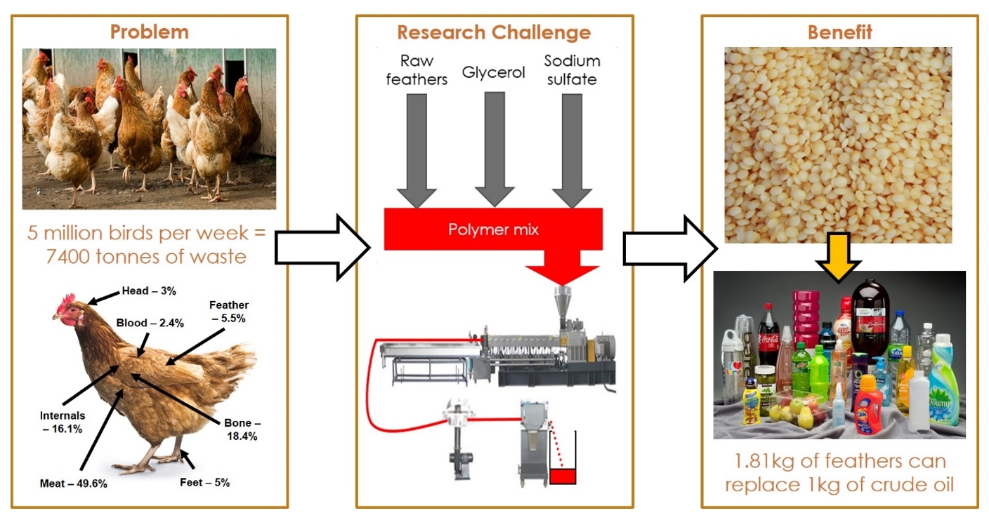 In addition to providing waste management solutions for the agri-food industry, the work also addresses a pressing sustainability issue for the polymer industry reducing its reliance on oil supplies needed for plastic production. The use of converted poultry waste as high load filler/additive/alternative could provide significant savings in oil usage.
