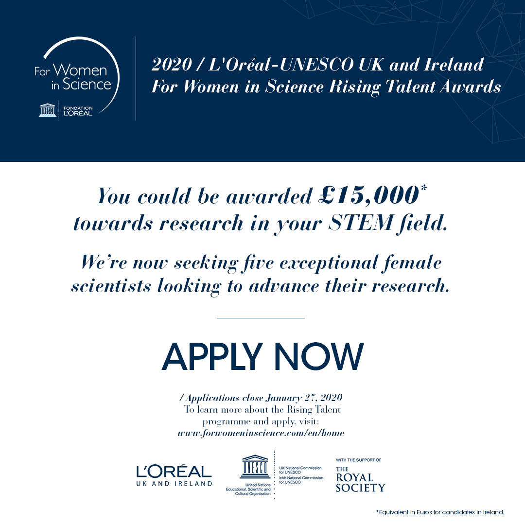 L’Oréal-UNESCO For Women in Science UK & Ireland will be awarding five outstanding female early-career scientists a bursary of £15,000 (equivalent € for candidates in Ireland), at the ceremony in London on Thursday 21 May 2020.