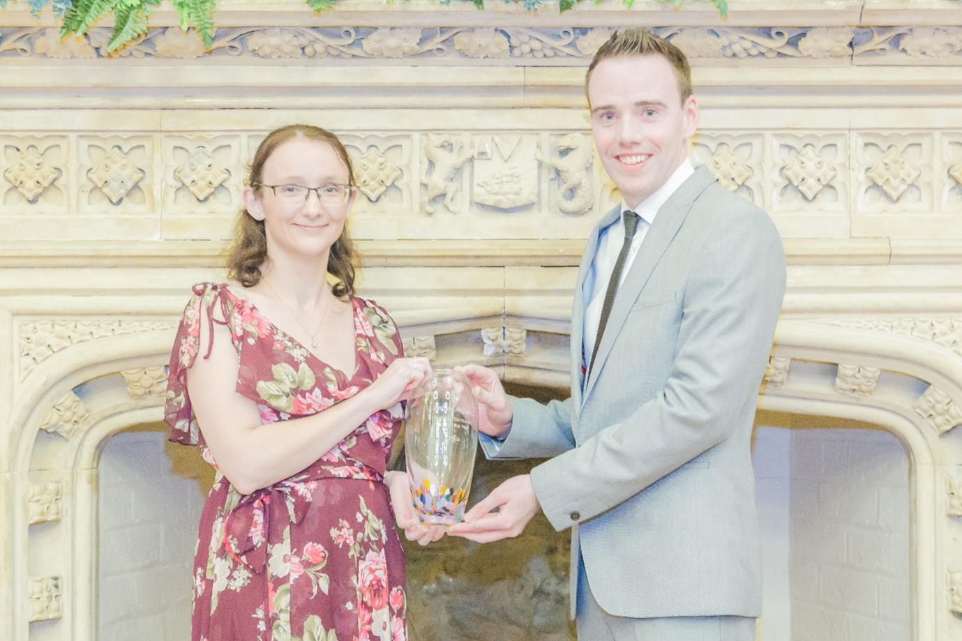 Lydia Combe, winner of the Pharmacy Forum NI Gold Medal for Overall Distinction in Pharmacy, receiving her award from Eamon O’Donnell, Chair of Pharmacy Forum NI