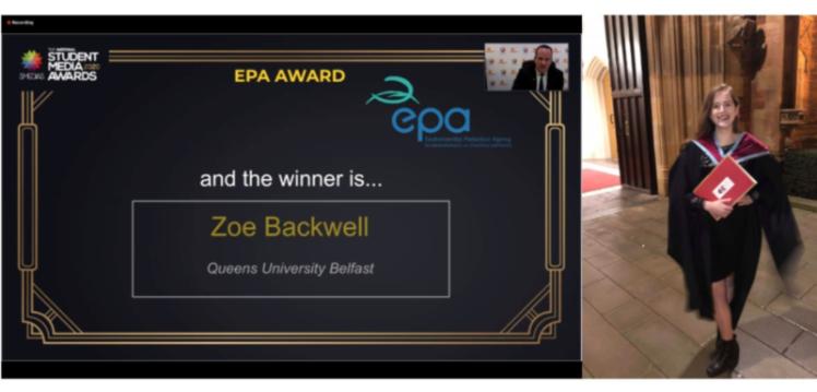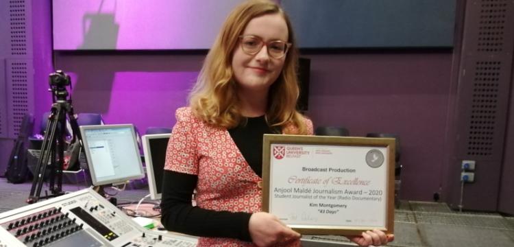 Kim Montgomery receive the prestegious Anjool Maldé Journalism prize for her work ‘43 Days’, which was produced as part of her Masters in Media and Broadcast Production 2019/20.