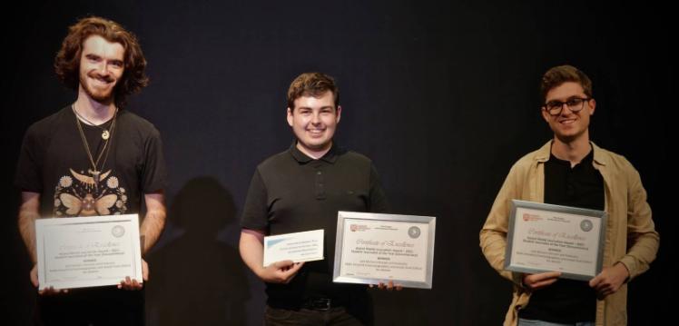 Jack McCann (Director and Producer), Malin Hempill (Cinematographer) and Joseph Scott (Editor) receive the prestigious Anjool Maldé Young Journalist of the Year Award for their film 'Skeletor' produced as part of their BA in Film Studies & Production