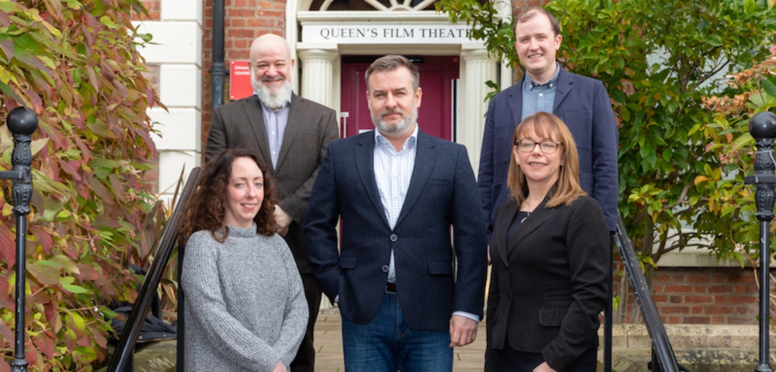 Representatives from Queen’s University and the National Lottery Heritage Fund at the launch event for Friel Reimagined. L-R: Frances McNally, Investment Manager, National Lottery Heritage Fund; Dr Kurt Taroff, Head of School of Arts, English and Languages; Dr Paul Murphy, Senior Lecturer, School of Arts, English and Languages and Project Lead, Friel Reimagined; Dr Conor McCafferty, Project and Outreach Manager, Friel Reimagined; Professor Nola Hewitt-Dundas, Pro-Vice Chancellor, Faculty of Arts, Humanities and Social Sciences.