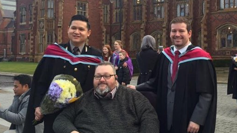 Damian was a first-class honours student, graduating with distinction, his intellectual contribution to our MA conflict transformation and social justice programme came in many forms. His MA dissertation project supervised by Prof. John Brewer entitled “Conflicted Identities: Assessing the impact of acquired disability on social identity. A comparative study of people with spinal cord injuries who have become disabled through accident or illness with those attained through the Conflict in Northern Ireland” was a deeply personal project anchored sensitively in a sophisticated rendering of social identity and disability theory. He was a stalwart advocate for disability justice and improved accessibility across all lines- locally in QUB and more widely in Northern Ireland. Damian had ambitions to start a PhD project after his MA, and we know that the academic world would have benefited greatly from his intellectual and ethical contributions. His passing brings many losses.
