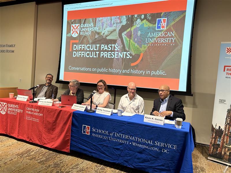 Symposium on “Difficult Pasts: Difficult Presents: Conversations on Public History and History in Public”, held at American University, Washington DC, and features (L-R) Prof. Dominic Bryan (HAPP), Prof. Penny von Eschen (UVA), Dr. Cheryl Lawther (QUB Law School), Prof. Philip Troutman (George Washington University), and Prof. Kevin K. Gaines (University of Virginia)