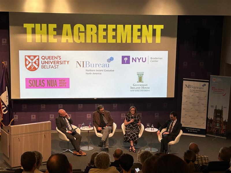 Panel following a screening of the QUB-RTÉ documentary, “The Agreement” on the Belfast/Good Friday Agreement, hosted by the NI Bureau at NYU’s Brademas Center, Washington DC, and features (L-R) Prof. Richard Collins (AHSS Faculty Dean for Internationalisation), Prof. Dominic Bryan (HAPP), Dr. Cheryl Lawther (QUB Law School) and Dr. Peter McLoughlin (HAPP)