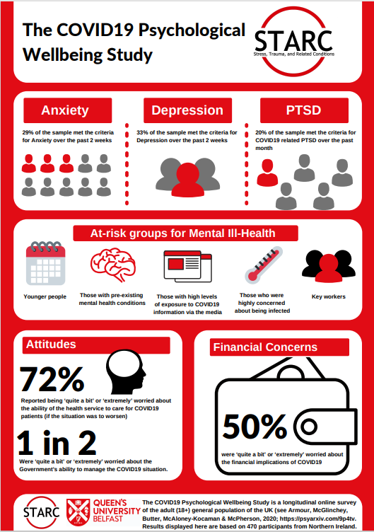 This work was picked up by several media outlets including by the Irish News in an article titled - Coronavirus: Queen's University study highlights impact of lockdown on mental health, the Irish Times in an article titled Covid-19 has ‘striking’ psychological impact in Northern Ireland and in the Irish Medical Times in an article titled – ‘Research shows impact of COVID-19 on mental health in the North’