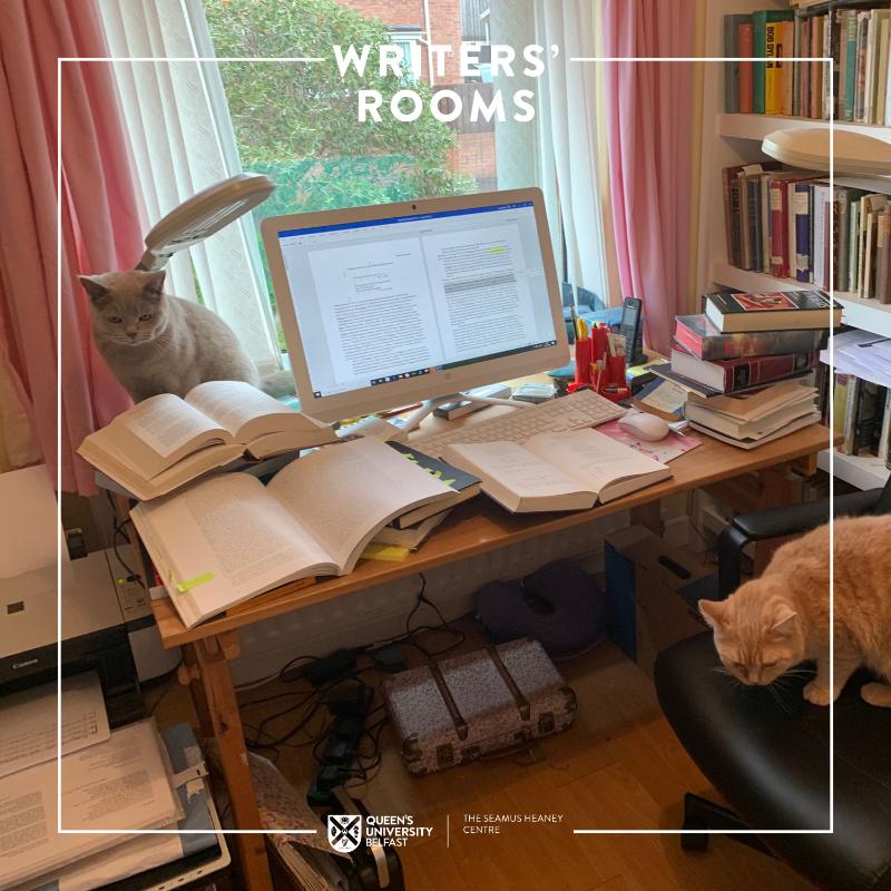 At my cat’s desk in the top floor bedroom of our mid-terrace pet and toddler palace in East Belfast.