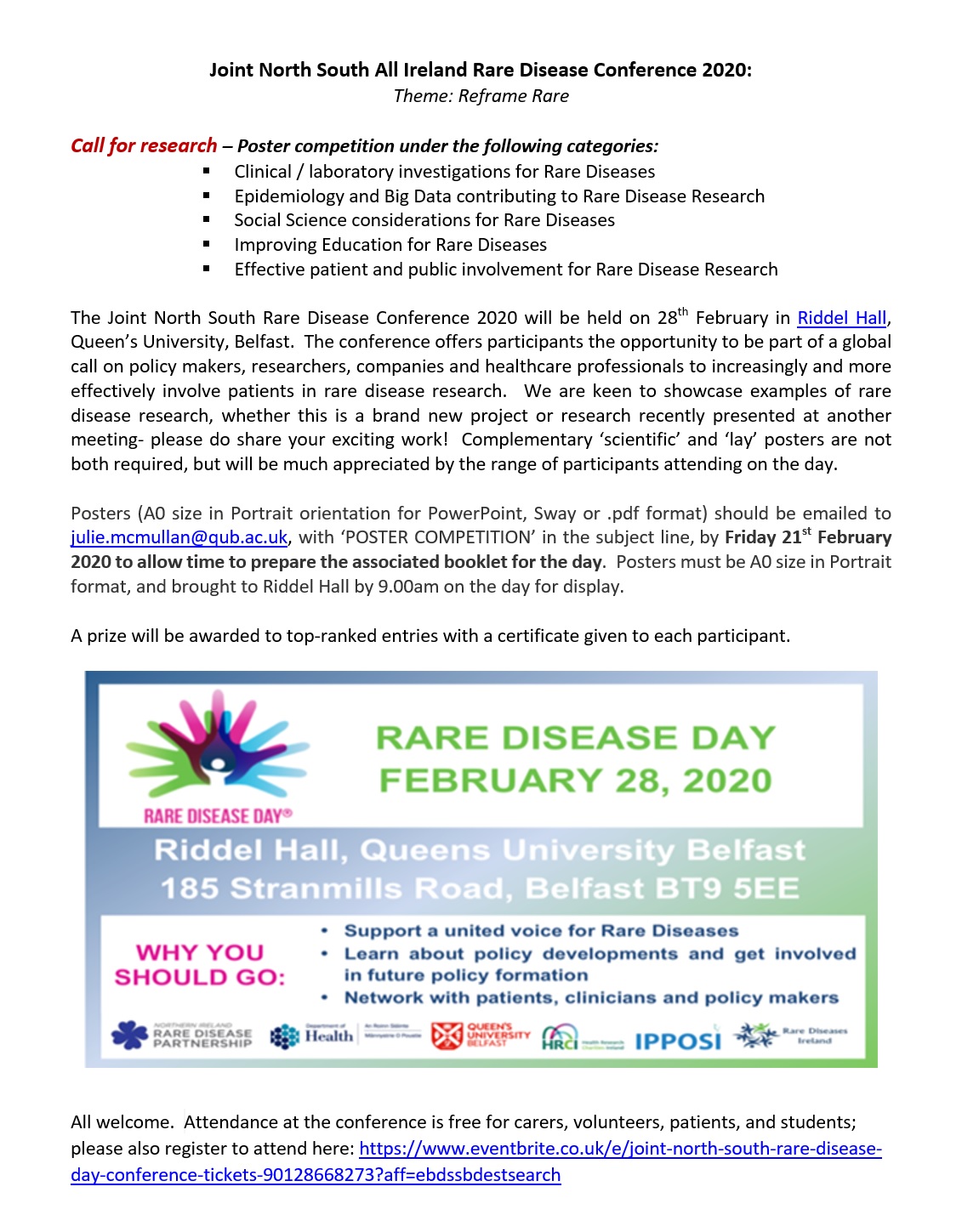 We are very keen to showcase some of the excellent rare disease research ongoing across Ireland and the UK in particular; we are happy to display posters that have been prepared for other meetings in the last year… We will be preparing a poster booklet for the meeting, so please do help us by forwarding posters at 300 dpi or higher to julie.mcmullan@qub.ac.uk by 21st February 2020.