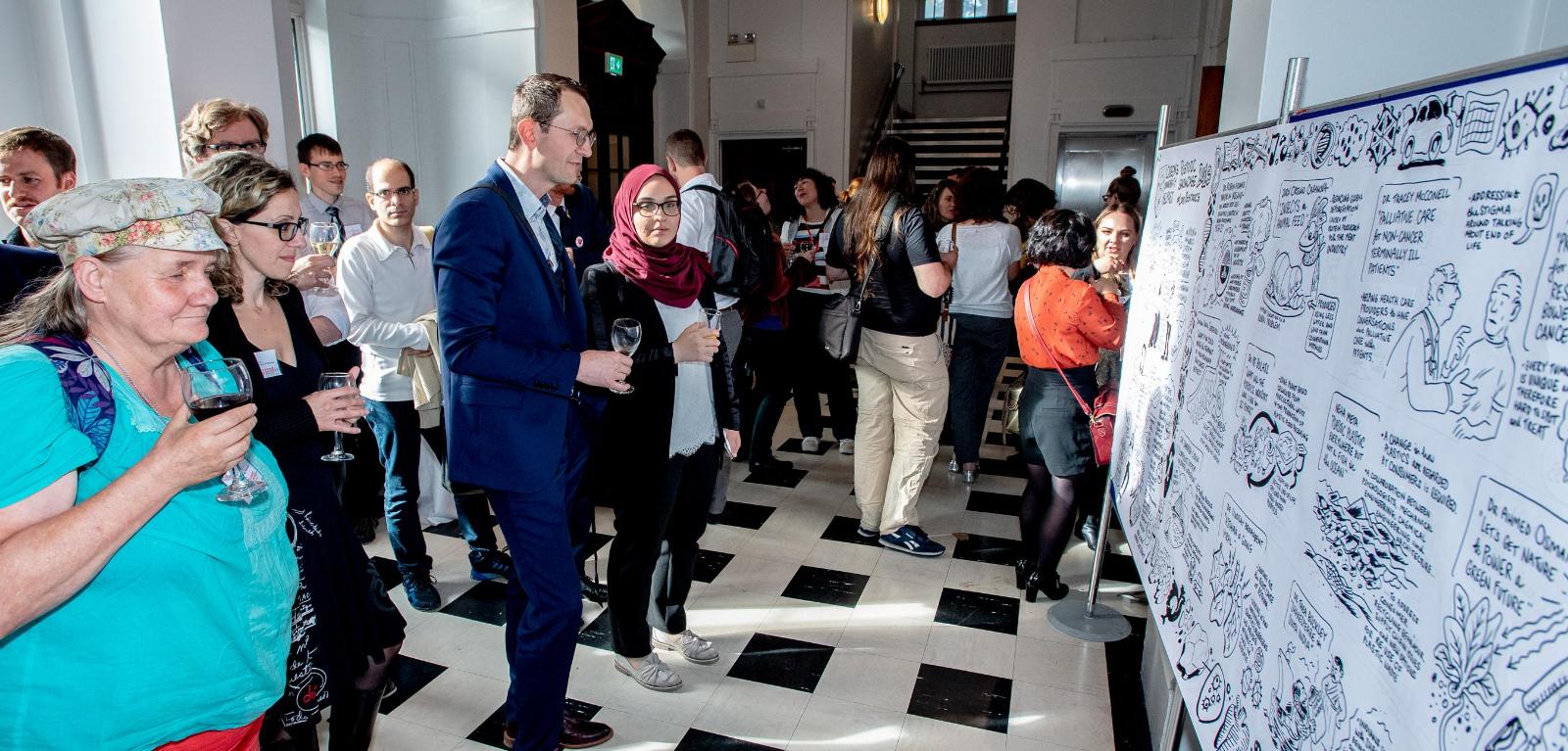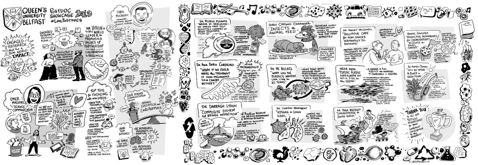 Keynote talks were delivered by musician, radio presenter and award-winning science communicator Emer Maguire, and Chris McCreery, Director of the Northern Ireland Science Festival and Chair of the Cathedral Quarter Arts Festival. Mini Postdoc Pitches followed, with 11 postdocs from all three Faculties giving a glimpse into their respective research areas. The Showcase also included poster presentations and a live illustrator before the awarding of this year's Postdoc Prizes.
