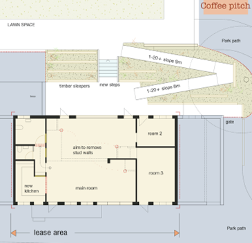 The proposed situation focuses on remodelling the building, repurposing the rooms currently occupied by council offices and improving disability accessibility to the building and bowling green.