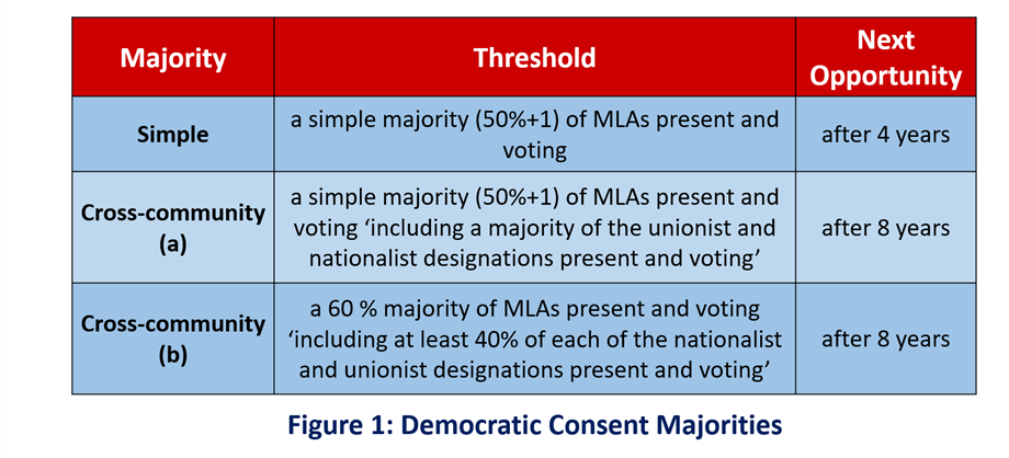 Democratic consent come in two forms: consent by a simple majority or consent with a cross-community majority. Which form of majority is achieved is important since it determines when the democratic consent mechanism can next be used. The requirements of each majority are set out in Article 18 and in Schedule 6A of the Northern Ireland Act 1998.