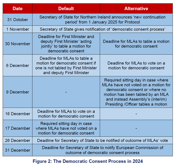 Although Article 18 provides only that the UK ‘provide the opportunity for democratic consent’, it is widely expected that a first democratic consent vote will be held in 2024. This is not only the consequence of how the Protocol has been presented in the UK Declaration, but also how UK legislation governing the use of the democratic consent mechanism has been written to include contingencies for a situation where there is no functioning Northern Ireland Executive, and the Northern Ireland Assembly is not meeting. Essentially, absent a functioning Executive, a democratic consent vote by MLAs will be held in November/December 2024.