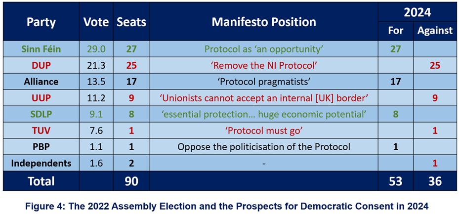 If, prior to 2024, outstanding issues are addressed some of those currently seen as likely to vote against may abstain. This would not alter the nature of the majority given no unionist party currently supports the Protocol. Similarly, if the lived experience of the Protocol is sufficiently adverse, some of those currently supportive of the Protocol could change their position, although this seems unlikely to happen. To note is that the Speaker will not have a vote.