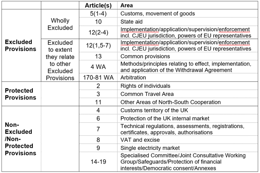 The Northern Ireland Protocol Bill proposes to change the terms of application of the Protocol in the UK. For example, it removes the direct effect of ‘excluded’ provisions in the Protocol and grants UK ministers discretionary powers to make law in these areas. Ministers may also add to or remove from the list of excluded provisions except in a small number of ‘protected’ provisions. If enacted the Northern Ireland Protocol Bill would in effect therefore introduce three new categories of legal provision to the UK in respect of Northern Ireland. These are as follows: ‘excluded’ provisions; ‘protected’ provisions; and provisions that are neither ‘excluded’ nor ‘protected’. Within the ‘excluded’ provisions there would be wholly excluded provisions and provisions that are excluded to the extent that they relate to other excluded provisions.