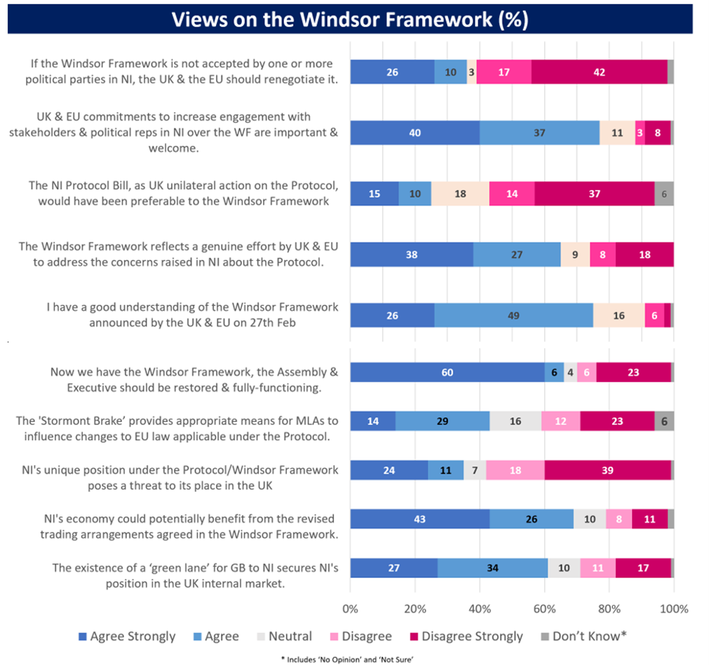 This Testing the Temperature report presents the findings of a poll of Northern Ireland voters on the Windsor Framework that was conducted three weeks after the UK Government and the European Commission announced the deal. Respondents to the poll on 18-20 March 2023 were asked two sets of questions and offered the opportunity to provide written comments on the Protocol and the Windsor Framework.