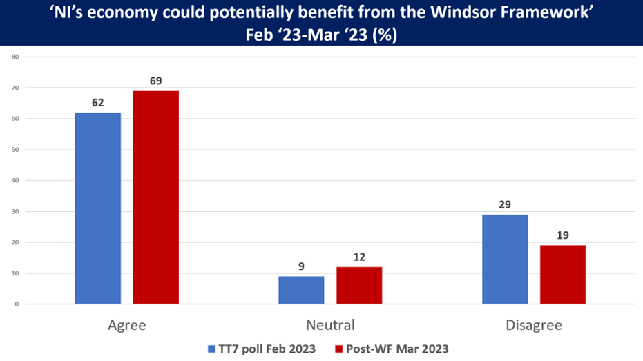 • Over two thirds of respondents (69%) believe that Northern Ireland’s economy could potentially benefit from the revised trading arrangements agreed in the Windsor Framework; 19% disagree.