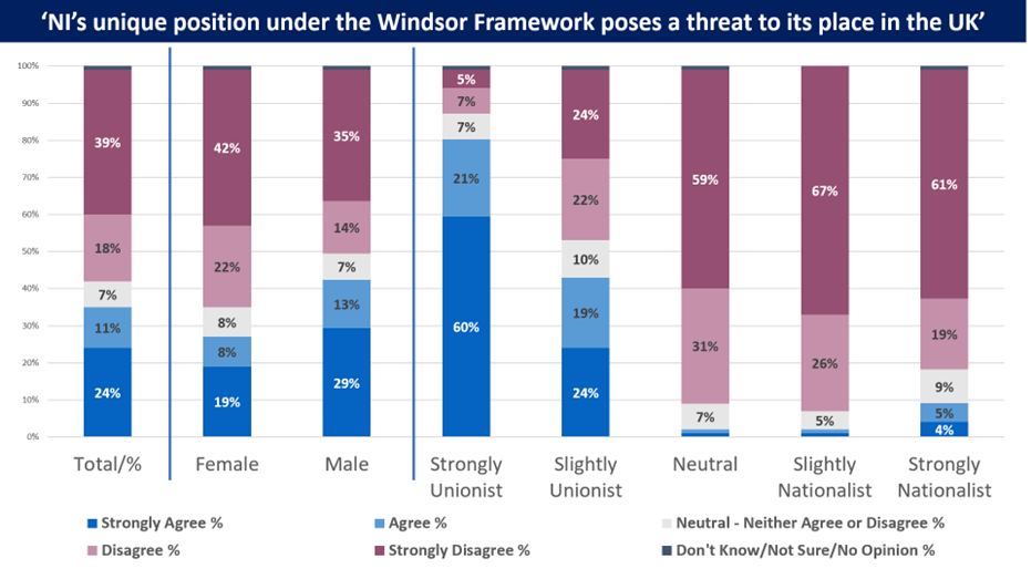 • 81% of those identifying as ‘strongly unionist’ believe Northern Ireland’s place in the United Kingdom is threatened by the Windsor Framework arrangements (60% strongly so). Those who identify as ‘slightly unionist’ have more varying views on the subject: 43% agree and 46% disagree.