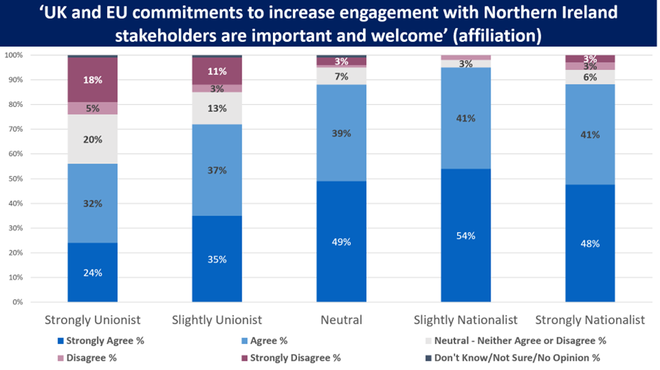 More than three quarters (77%) regard the commitments made by the UK government and the EU to increase engagement with stakeholders and political representatives in Northern Ireland as important and welcome (see Figure 1 above). This includes the majority of respondents from across the political spectrum in Northern Ireland (see Figure 7).