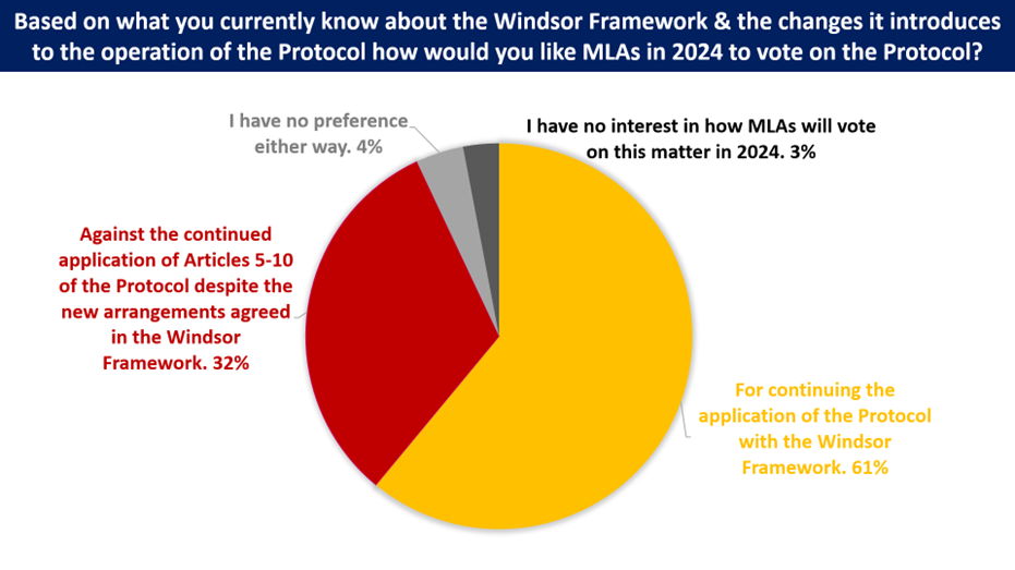 The first set of questions covered views on different aspects of the Windsor Framework. The second set of questions asked participants how, in the light of the Windsor Framework, they would like members of the Northern Ireland Assembly (MLAs) to vote in the ‘democratic consent’ vote on Articles 5-10 of the Protocol that will be held at the end of 2024 and the importance of the Protocol for any future Northern Ireland Assembly election.