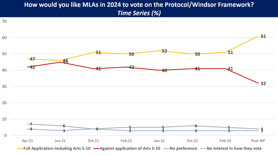 • With the Windsor Framework, 61% of respondents would like to see members of the Northern Ireland Assembly (MLAs) vote in favour of the continued application of the Protocol when they hold their ‘democratic consent’ vote in 2024. This compares with 51% in our last pre-Windsor Framework poll in February 2023.