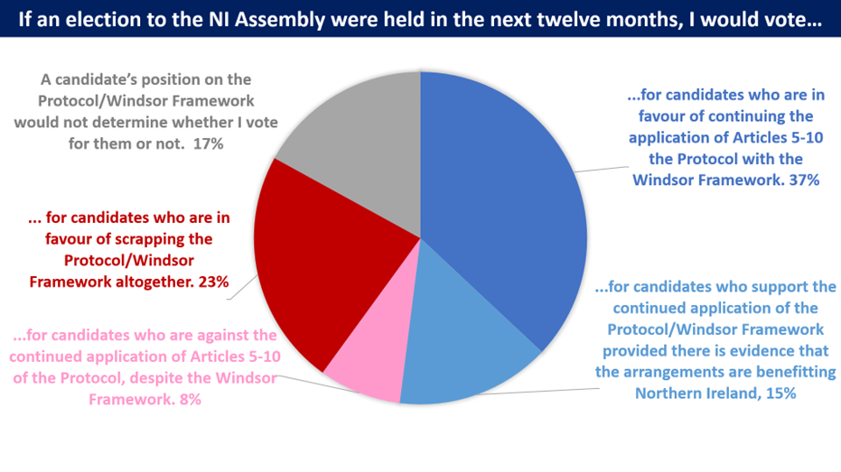• Almost a quarter (23%) will only vote for candidates in the next Northern Ireland Assembly election who are in favour of scrapping the Protocol and/or the Windsor Framework.