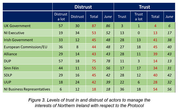 Indeed, trust among survey respondents in the ability of all other actors to manage the interests of Northern Ireland in respect of the Protocol remains strikingly low (see Figure 4). This was particularly true of the UK government previously and the results have not changed. More than four fifths of respondents (87%) continue to distrust the UK government (and a majority distrust it a lot).