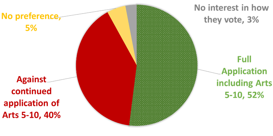 Most respondents (92%) have a view on how they wish their MLAs to vote: 52% in favour of the continued application of Articles 5-10 and 40% against (see Figure 7). These mirror the figures from October 2021 and so confirm the marked gap in views that has emerged since the June 2021 poll when voters were split almost evenly (46% in favour and 45% against).