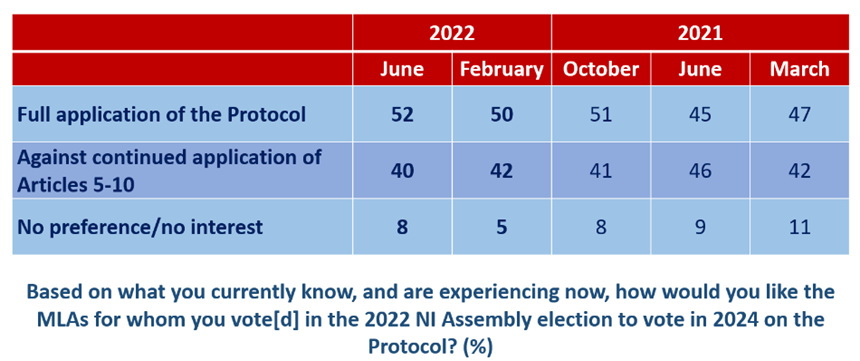 At the time of the February poll, there was a sense that UK-EU relations over the Protocol had become, at least in terms of tone, more convivial. A meeting of the EU-UK Joint Committee (the first since June 2021) was held on 21 February 2022 with Foreign Secretary Liz Truss and her EU co-chair, Maroş Šefčovič, managing to produce a joint statement. A meeting of the Specialised Committee for the Protocol was then held on 8 March 2022. The European Commission also proposed a schedule of meetings at technical level to carry on discussions on how to resolve outstanding issues regarding implementation of the Protocol.