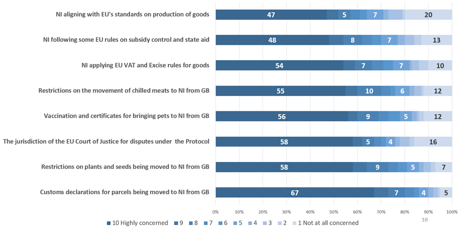 • The issue of least concern is Northern Ireland aligning with the EU’s standards for the production of goods, followed by the application of EU rules on subsidy control and state aid.