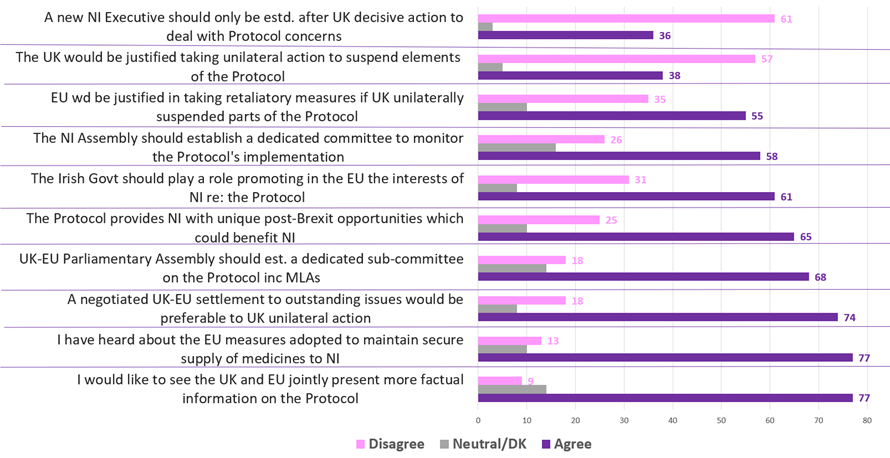 Trust in the Northern Ireland Executive to manage the interests of Northern Ireland with respect to the Protocol remains strikingly low (19%) (with only the UK Government suffering lower levels of trust) but there has been a slight drop in levels of distrust to 44%.