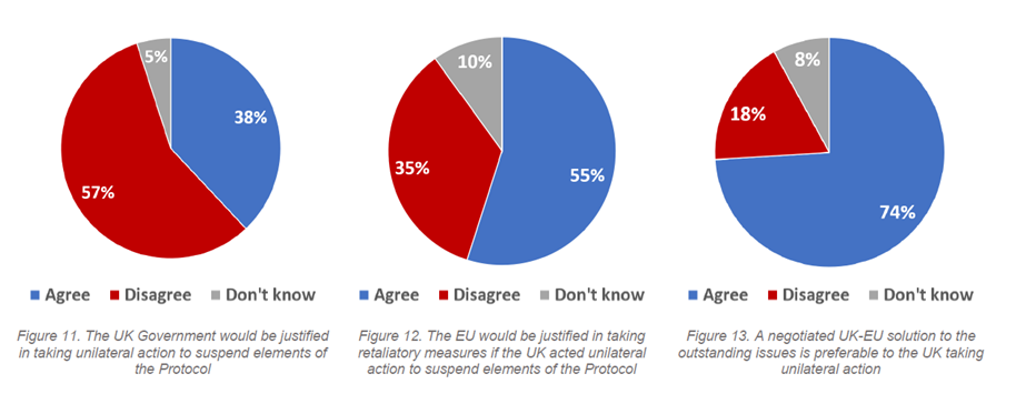 The final section of the poll involved a re-run of some previous questions, some questions regarding the possibility of unilateral action by the UK government on the Protocol, and some questions on the significance of recent political developments for the Protocol (see Figure 10).