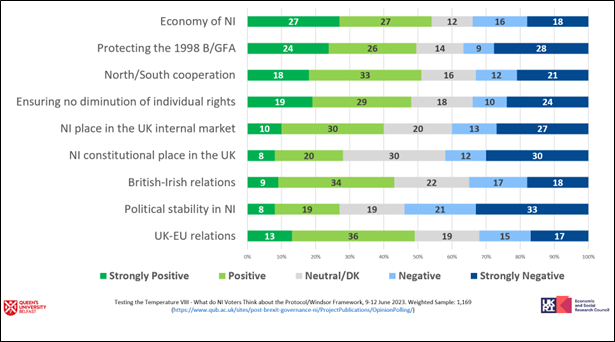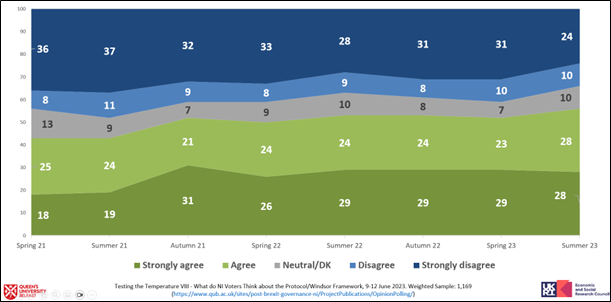 Opinions remain divided on the impact of the Protocol (see Figure 3) yet there is evidence of some notable shifts in the light of the adoption of the Windsor Framework suggesting an easing of political tensions and increased acceptance of the Protocol.