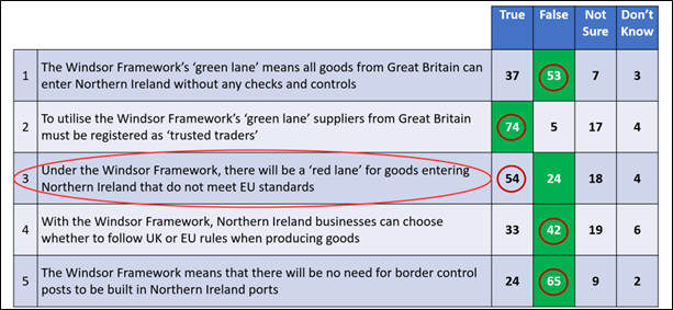 Where people are less sure is in terms of the implementation period for the Windsor Framework (only a third know it runs to Autumn 2025), and on the meaning of the green/red lane – 54% mistakenly answered that there will be a ‘red lane’ for goods entering Northern Ireland that do not meet EU standards (the ‘red lane’ is the short-hand for the procedures to be followed by those who want no doubt that what they are bringing into Northern Ireland meets EU standards and can thus ultimately freely enter the EU market).